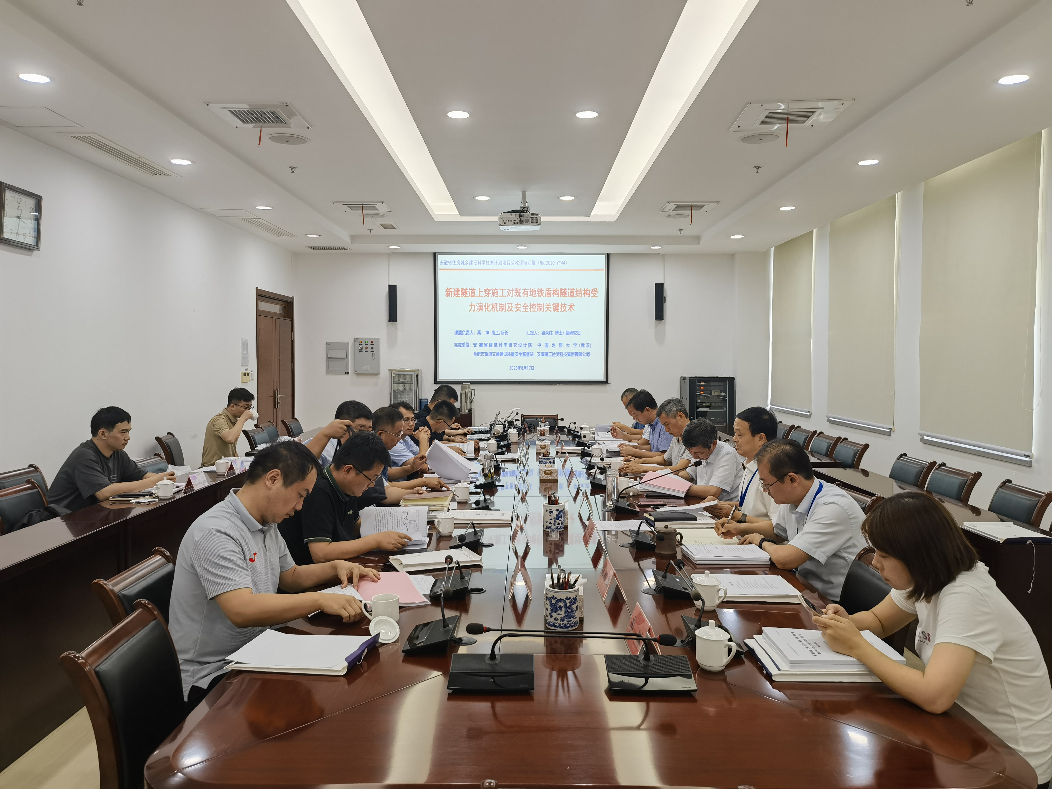 8月17日下午,安徽省住房和城鄉(xiāng)建設(shè)廳在合肥市組織召開了由安徽建工檢測科技集團(tuán)有限公司、安徽省建筑科學(xué)研究設(shè)計院、中國地質(zhì)大學(xué)(武漢)等單位完成的“新建隧道上穿施工對既有地鐵盾構(gòu)隧道結(jié)構(gòu)受力演化機(jī)制及安全控制關(guān)鍵技術(shù)”項目驗收評價會。安徽省住房和城鄉(xiāng)建設(shè)廳建筑節(jié)能與科技處處長陳必喜、副處長朱力、安徽建工檢測科技集團(tuán)有限公司副總經(jīng)理郭楊及驗收評價委員會專家、項目組成員等20余人出席會議,會議成立了以原安徽大學(xué)校長程樺為主任委員的驗收評價專家委員會。安徽省住建廳建筑節(jié)能與科技處處長陳必喜主持會議。