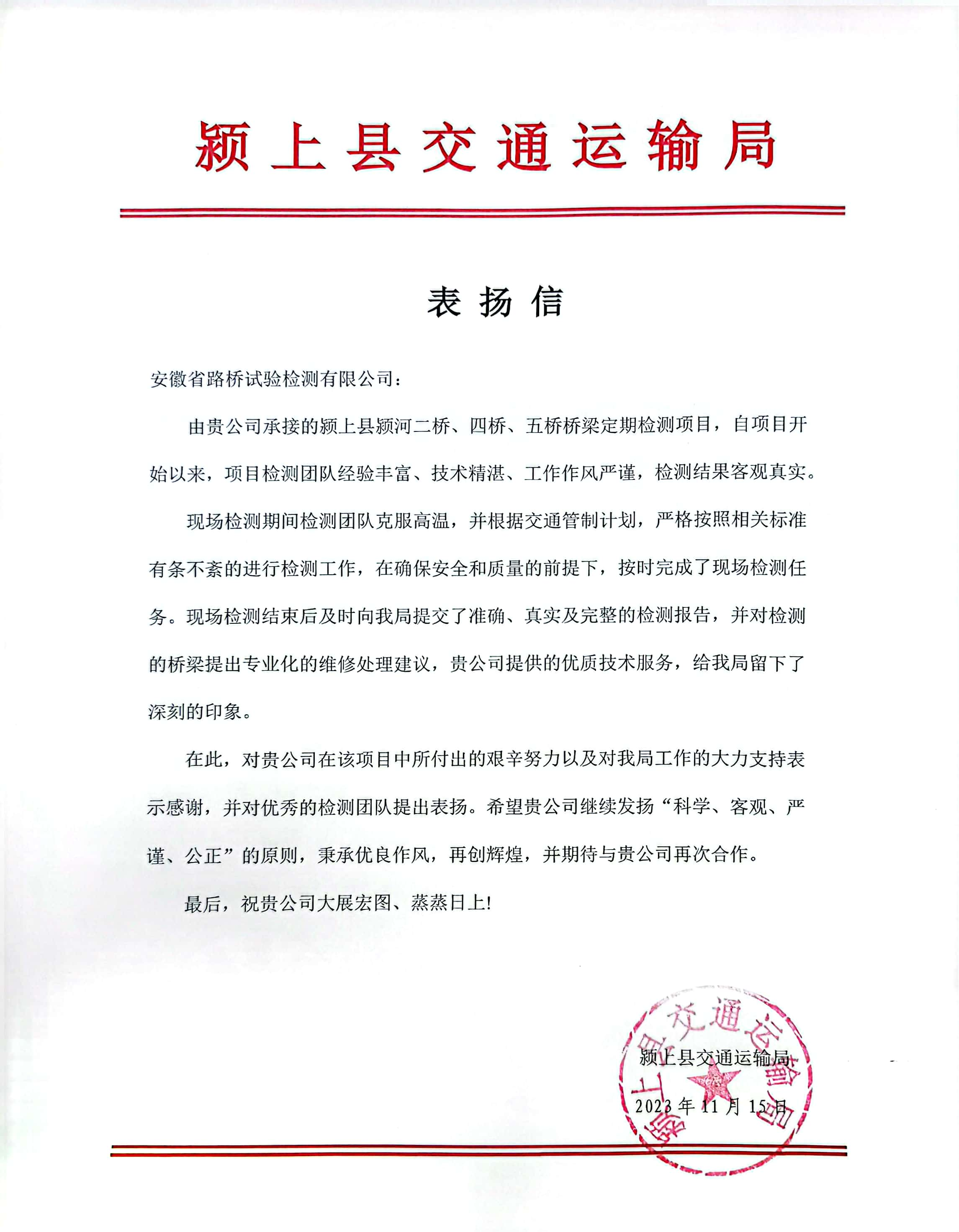 喜報(bào)!建工檢測集團(tuán)路橋檢測公司獲潁上縣交通運(yùn)輸局通報(bào)表揚(yáng)