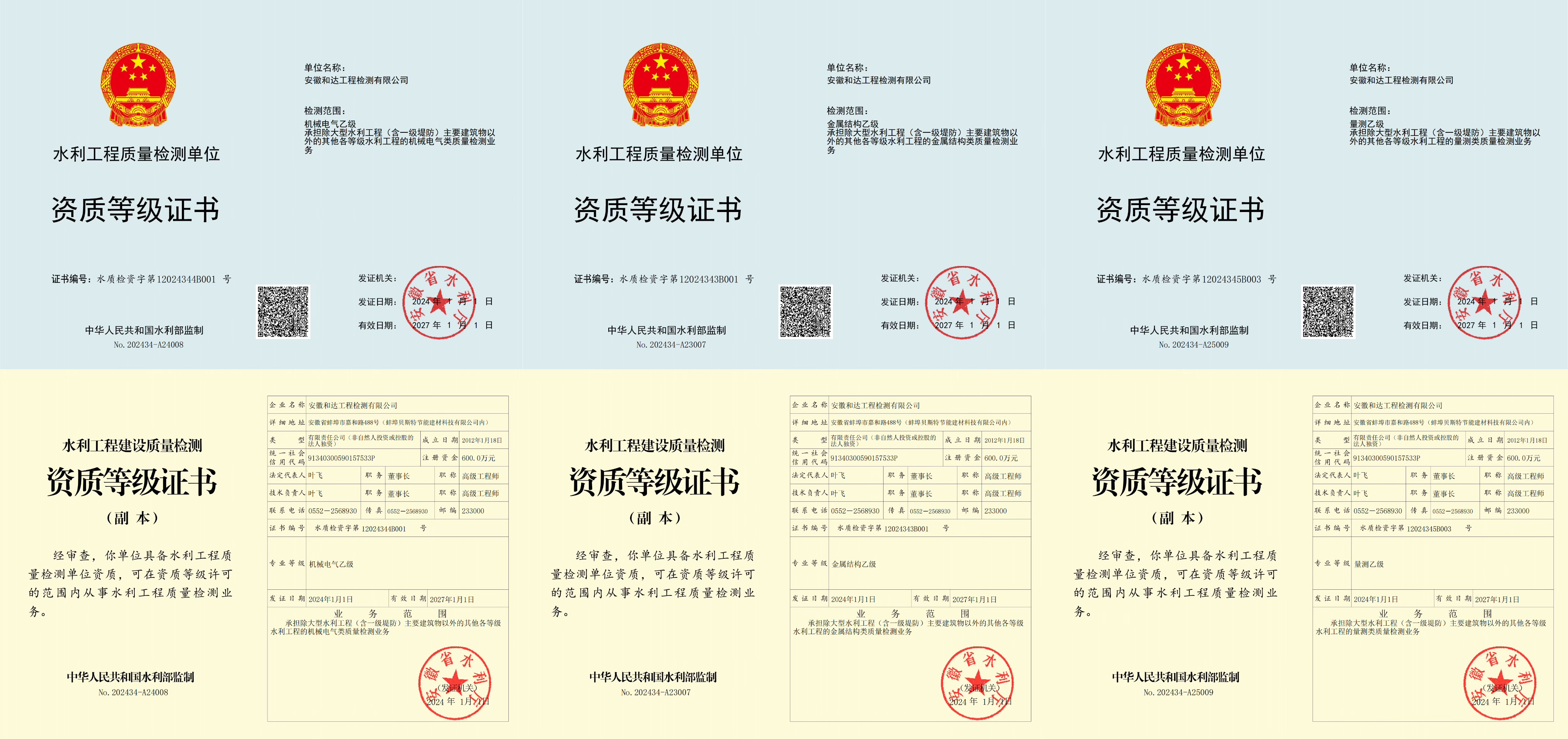 喜報丨新年第一份禮物——和達檢測取得水利工程“金屬結(jié)構(gòu)、機械電氣乙級證書和量測乙級換證復核證書”