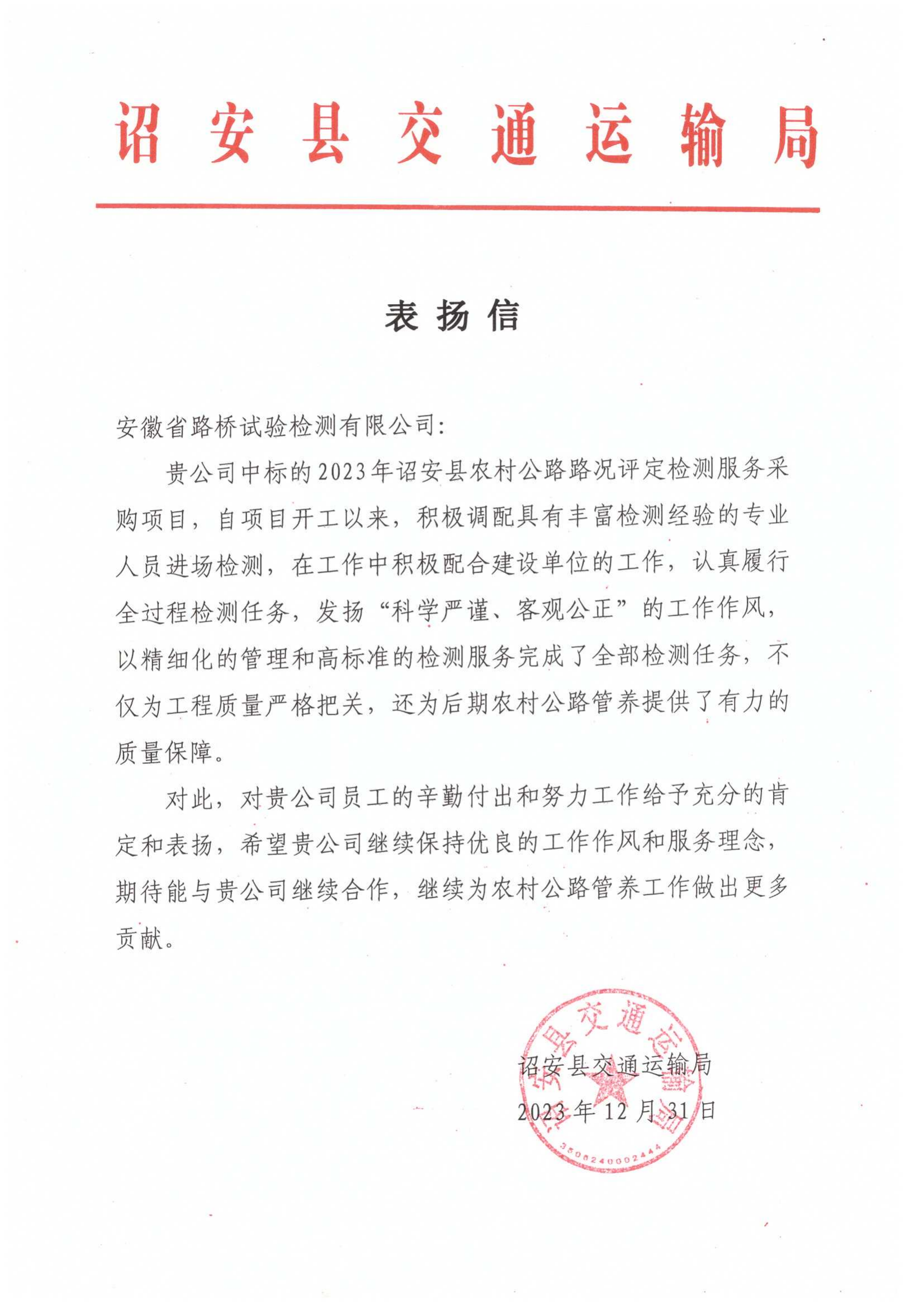 近日,福建省漳州市詔安縣交通運(yùn)輸局向安徽省路橋試驗(yàn)檢測(cè)有限公司發(fā)來(lái)了一封表?yè)P(yáng)信。對(duì)路橋檢測(cè)公司在保障道路交通管養(yǎng)、提供優(yōu)質(zhì)技術(shù)支持等方面的工作給予高度評(píng)價(jià)。