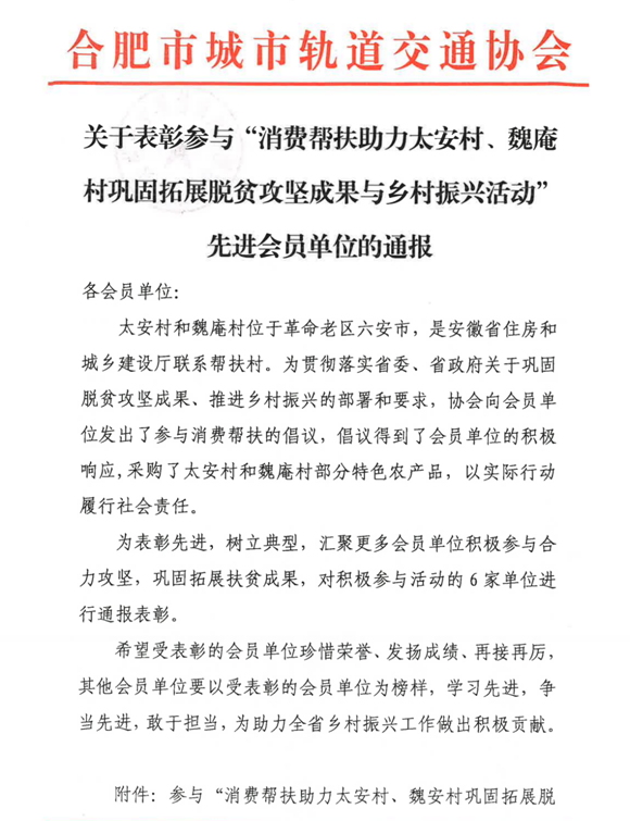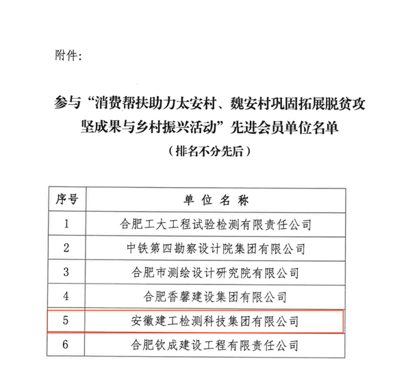 近日,建工檢測(cè)榮獲合肥市城市軌道交通協(xié)會(huì)表彰參與“消費(fèi)幫扶助力太安村、魏安村鞏固拓展脫貧攻堅(jiān)成果與鄉(xiāng)村振興活動(dòng)”先進(jìn)會(huì)員單位榮譽(yù)稱號(hào)。