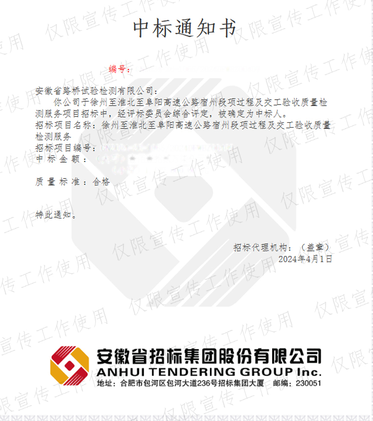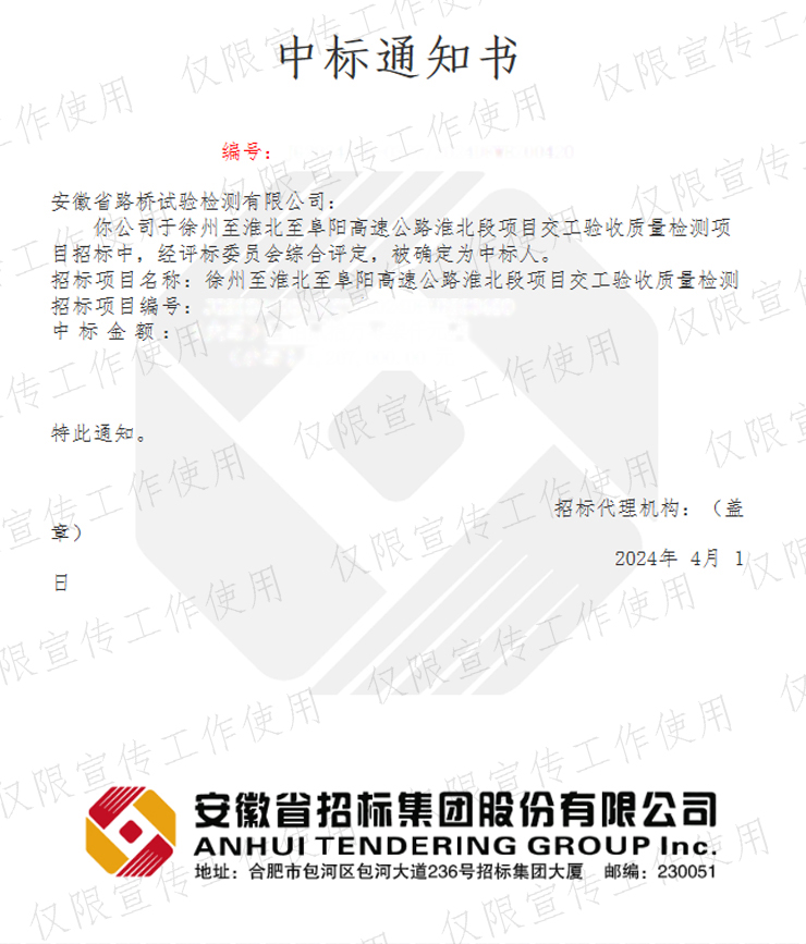 4月1日,安徽省路橋試驗(yàn)檢測有限公司接連中標(biāo)徐州至淮北至阜陽高速公路淮北段項(xiàng)目交工驗(yàn)收質(zhì)量檢測項(xiàng)目及徐州至淮北至阜陽高速公路宿州段過程及交工驗(yàn)收質(zhì)量檢測項(xiàng)目。一天連中兩標(biāo),標(biāo)志著路橋檢測公司在高速交工檢測領(lǐng)域?qū)崿F(xiàn)了里程碑式的跨越。