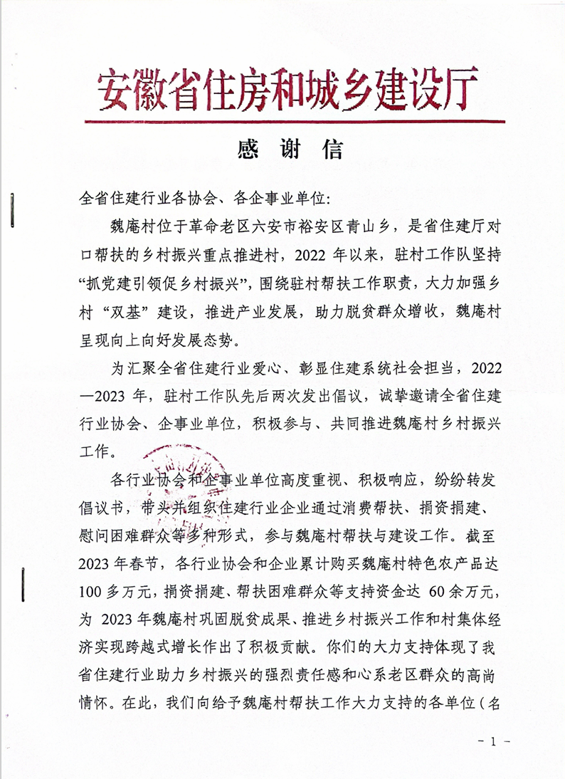 省住房和城鄉(xiāng)建設(shè)廳致信感謝我司助力脫貧攻堅工作