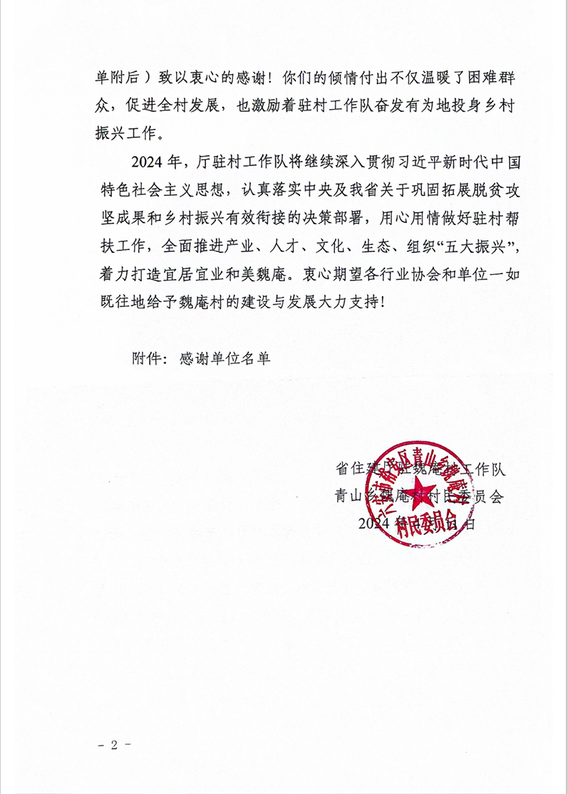 2024年,建工建測將以二十大精神為指引,深入貫徹落實黨中央、省委省政府關(guān)于鞏固脫貧攻堅和鄉(xiāng)村振興的工作要求,堅守初心使命、堅定使命擔(dān)當(dāng),積極履行國有企業(yè)社會責(zé)任,繼續(xù)加大幫扶力度,助力地方經(jīng)濟發(fā)展和建設(shè),為推進鄉(xiāng)村振興、助力魏庵村經(jīng)濟社會發(fā)展工作繼續(xù)貢獻檢測力量。