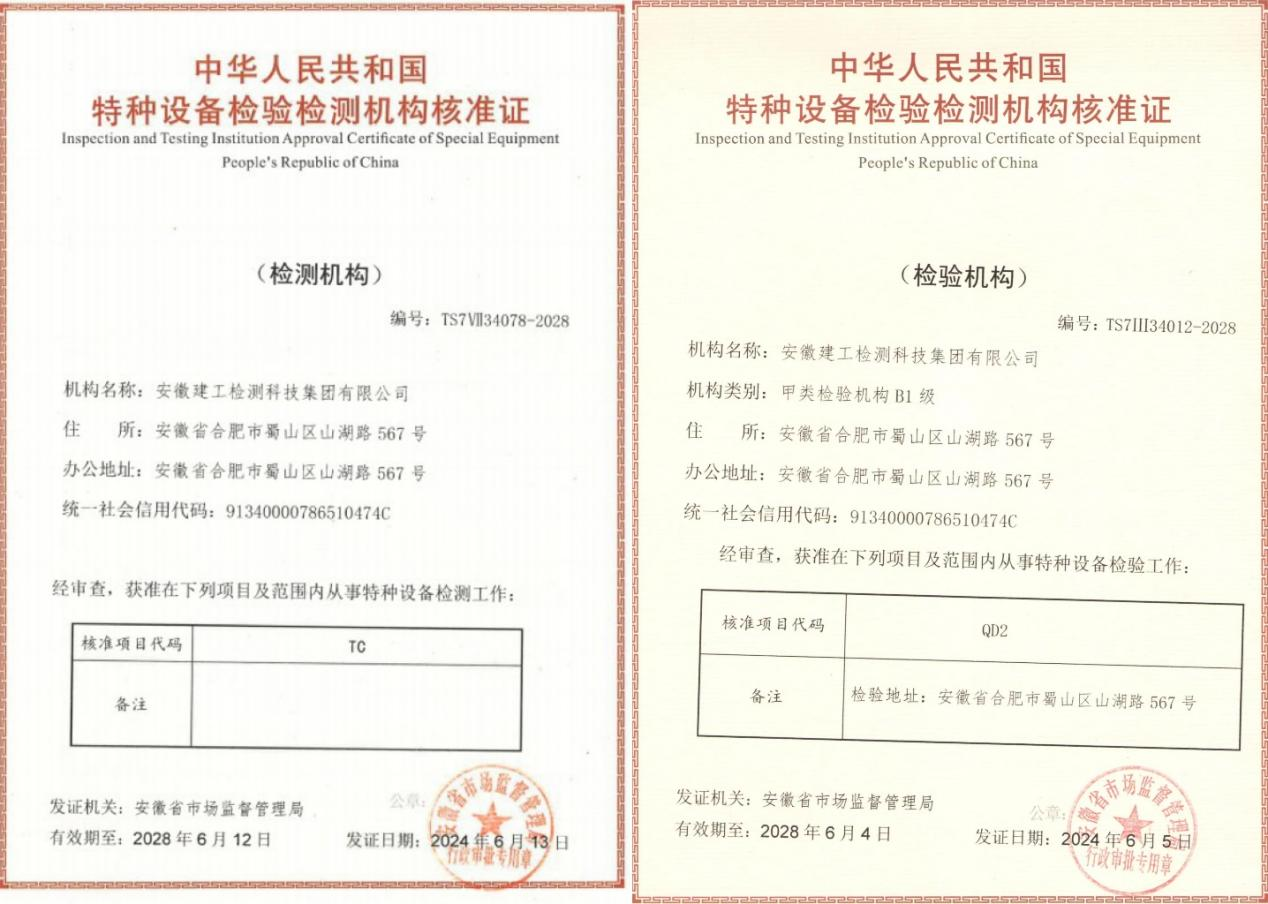 六月上旬,經(jīng)安徽省市場監(jiān)督管理局批復(fù),建工檢測先后取得了特種設(shè)備檢驗機構(gòu)核準(zhǔn)資質(zhì)(甲類檢驗機構(gòu)B1級)及電梯檢測(TC)資質(zhì)。該兩項資質(zhì)的取得,標(biāo)志著建工檢測現(xiàn)已具備全國范圍內(nèi)開展特種設(shè)備檢驗檢測工作的資質(zhì)。