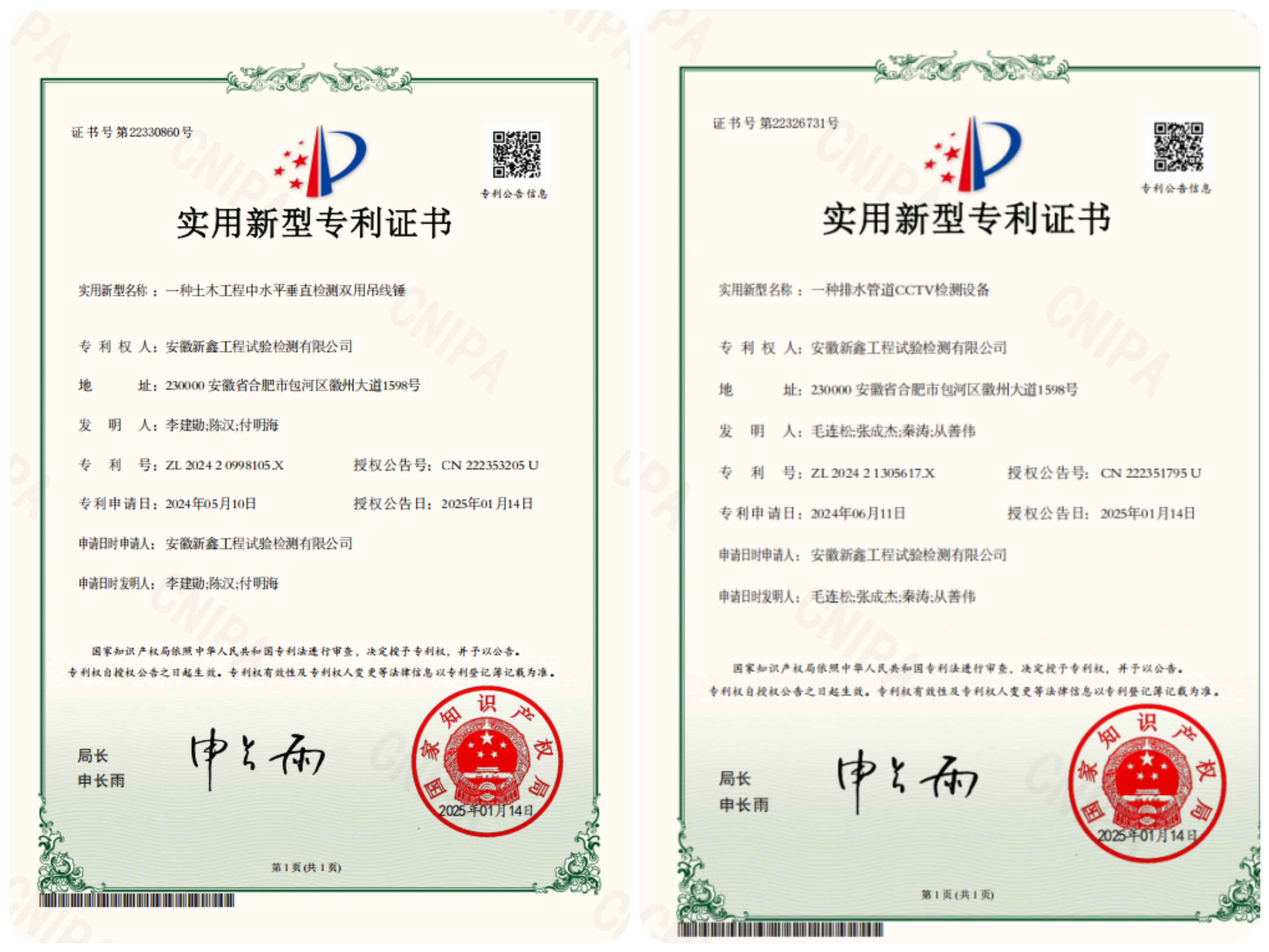 近日,新鑫檢測(cè)申請(qǐng)的兩項(xiàng)實(shí)用新型專利《一種排水管道CCTV檢測(cè)設(shè)備》和《一種土木工程中水平垂直檢測(cè)雙用吊線錘》獲得國(guó)家知識(shí)產(chǎn)權(quán)局授權(quán)。
