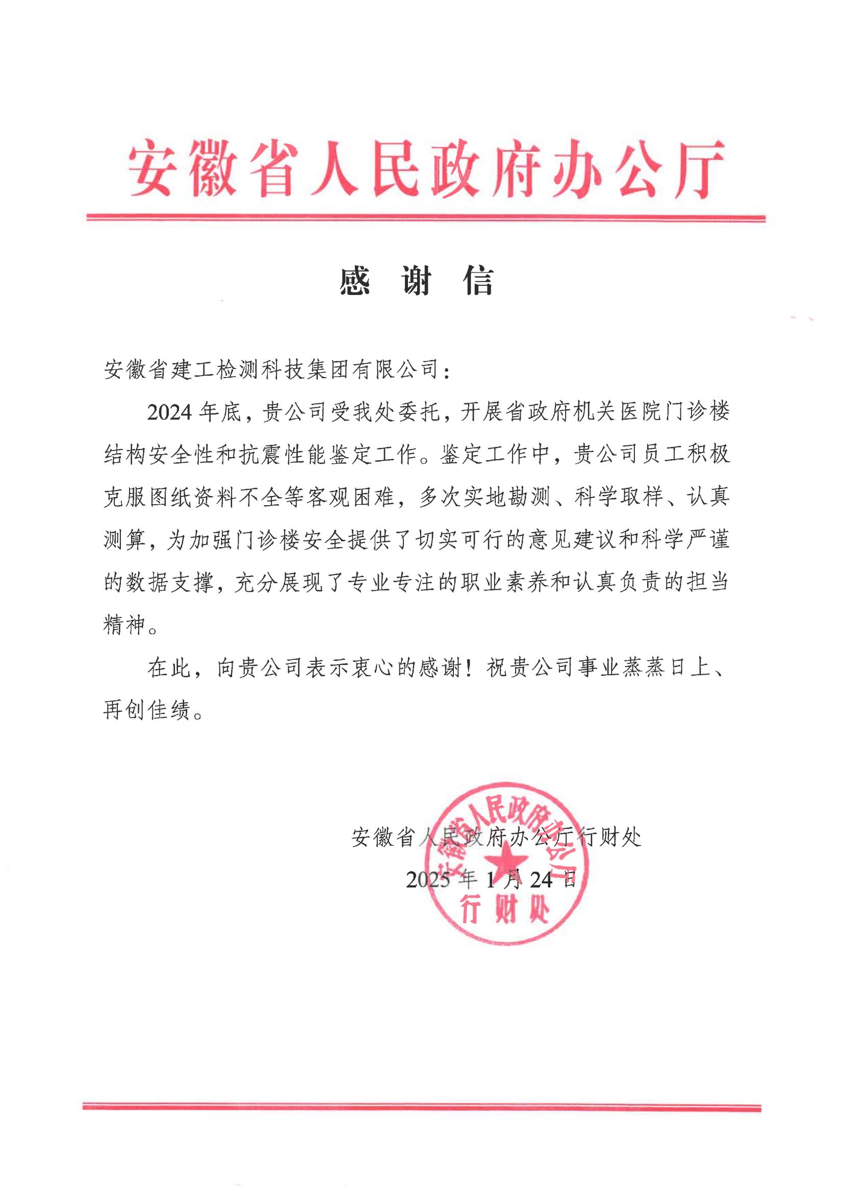 安徽省人民政府辦公廳向建工檢測(cè)發(fā)來(lái)感謝信!