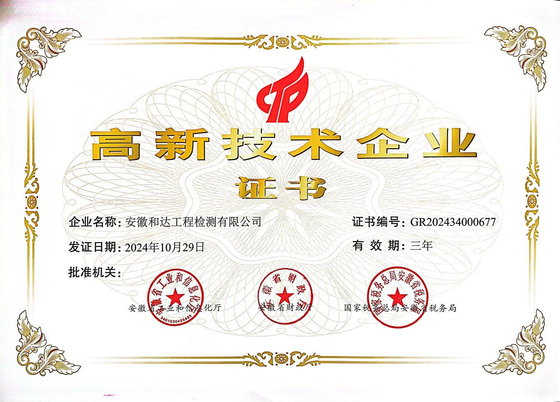 近日,建工檢測所屬子公司和達檢測順利通過高新技術企業(yè)認定,喜獲由安徽省工業(yè)和信息化廳、安徽省財政廳、國家稅務總局安徽省稅務局聯(lián)合頒發(fā)的國家級“高新技術企業(yè)”證書,成為建工檢測本部及所屬單位在內(nèi)的第7家高新技術企業(yè)。
