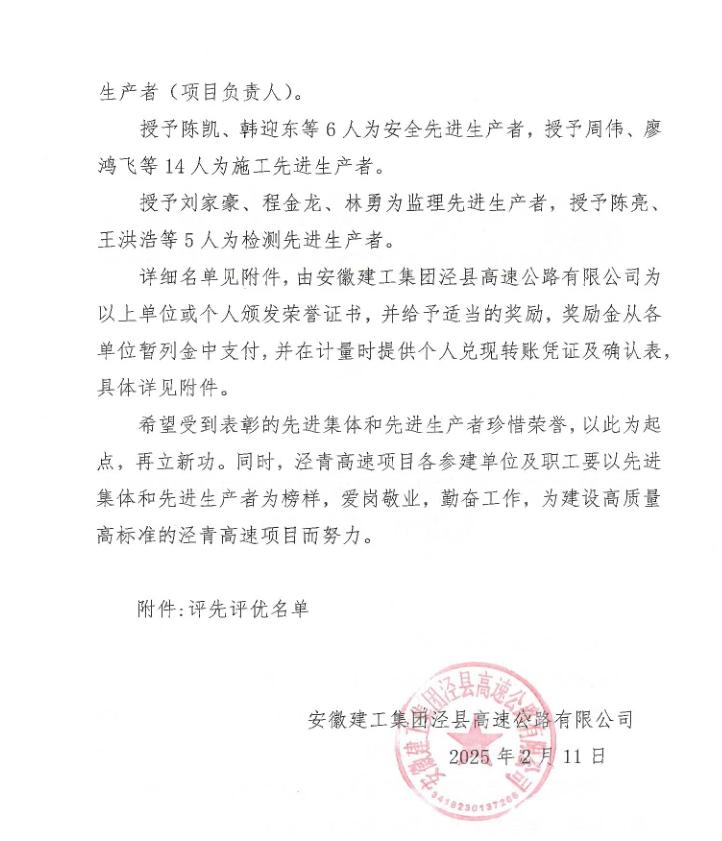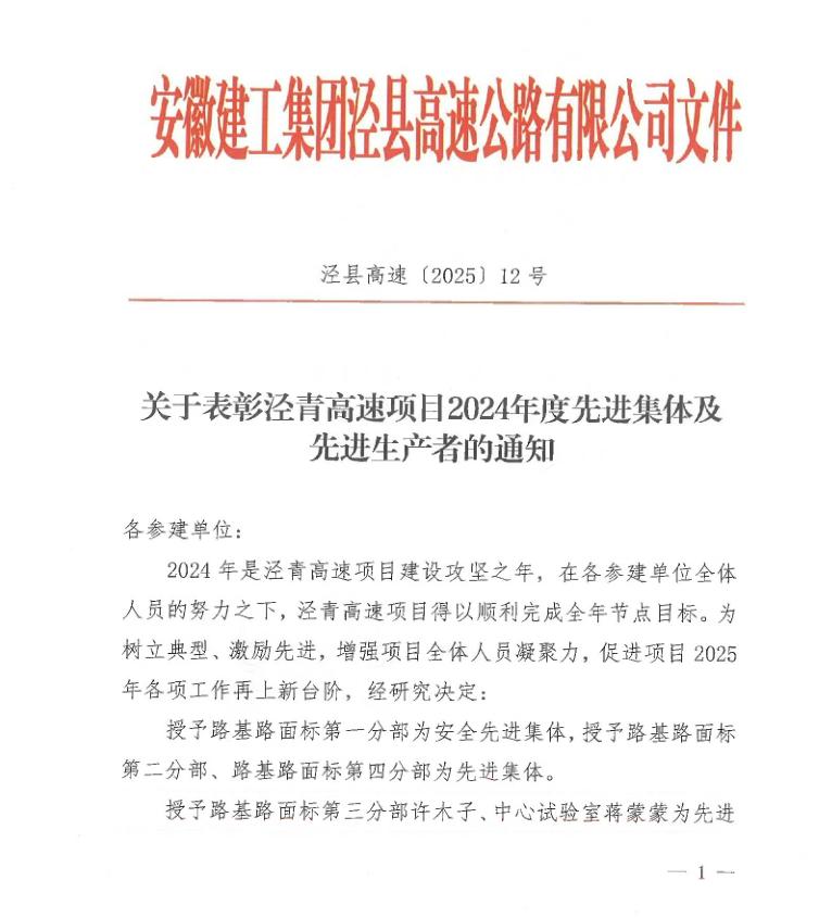 近日,從安徽建工集團涇縣高速公路有限公司傳來喜訊,路橋檢測宣城至東至高速公路涇縣至青陽界段中心試驗室蔣蒙蒙等4位同志分別榮獲2024年度先進生產(chǎn)者(項目負責(zé)人)、先進生產(chǎn)者(檢測)人員稱號。