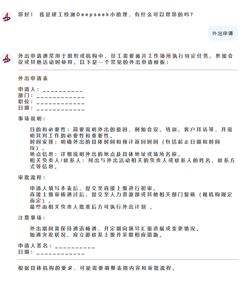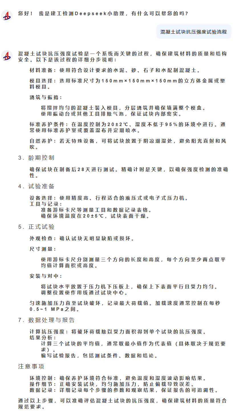 本次測試主要涵蓋了Deepseek的規(guī)章制度問答咨詢等通用領域應用,實現(xiàn)了Deepseek在檢驗檢測特定行業(yè)業(yè)務場景的應用。未來,建工檢測將持續(xù)探索Deepseek等大模型技術在檢驗檢測行業(yè)智能導辦、智能數(shù)據(jù)分析、智能文檔管理等應用場景,以技術支撐、科技賦能、創(chuàng)新驅(qū)動助力公司高質(zhì)量發(fā)展。