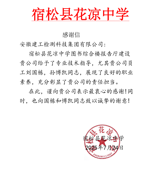 近日,宿松縣花涼中學(xué)向建工檢測(cè)發(fā)來感謝信,對(duì)公司特檢中心在宿松縣花涼中學(xué)圖書綜合樓報(bào)告廳建設(shè)過程中給予的專業(yè)技術(shù)指導(dǎo)表示感謝,并對(duì)公司的責(zé)任擔(dān)當(dāng)和員工的職業(yè)素養(yǎng)給予充分肯定。