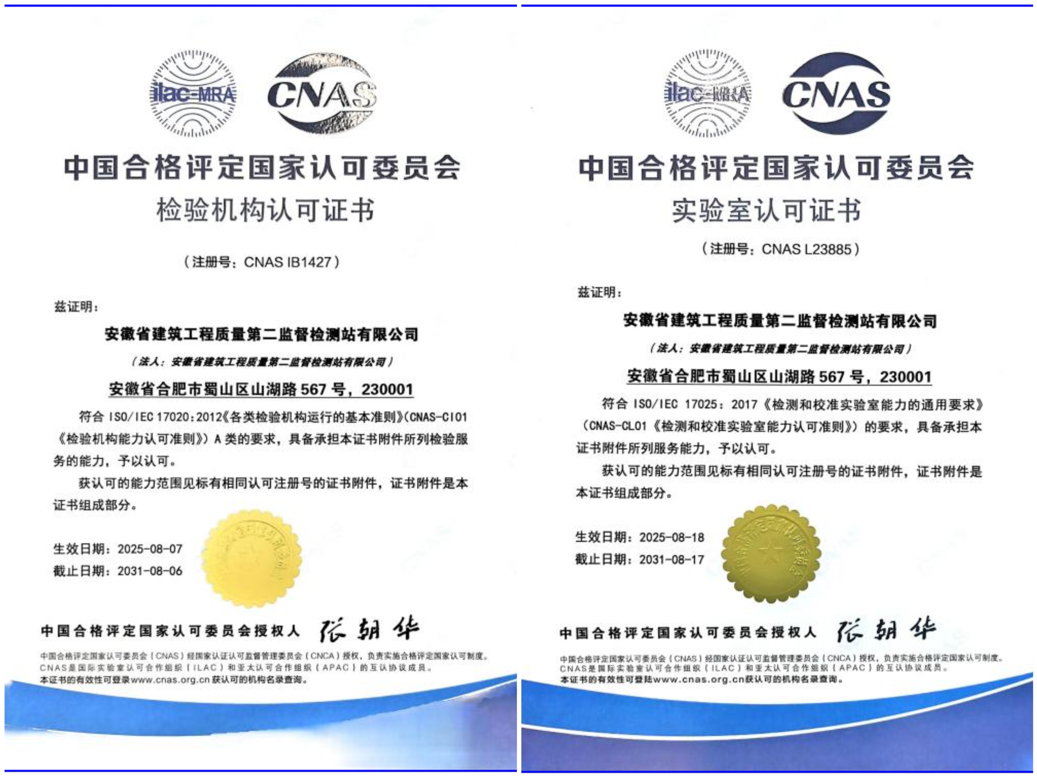 近日,安徽省建筑工程質(zhì)量第二監(jiān)督檢測站有限公司(以下簡稱“二站”)順利通過中國合格評定國家認可委員會(CNAS)評定,成功獲得檢驗機構(gòu)認可證書和實驗室認可證書。