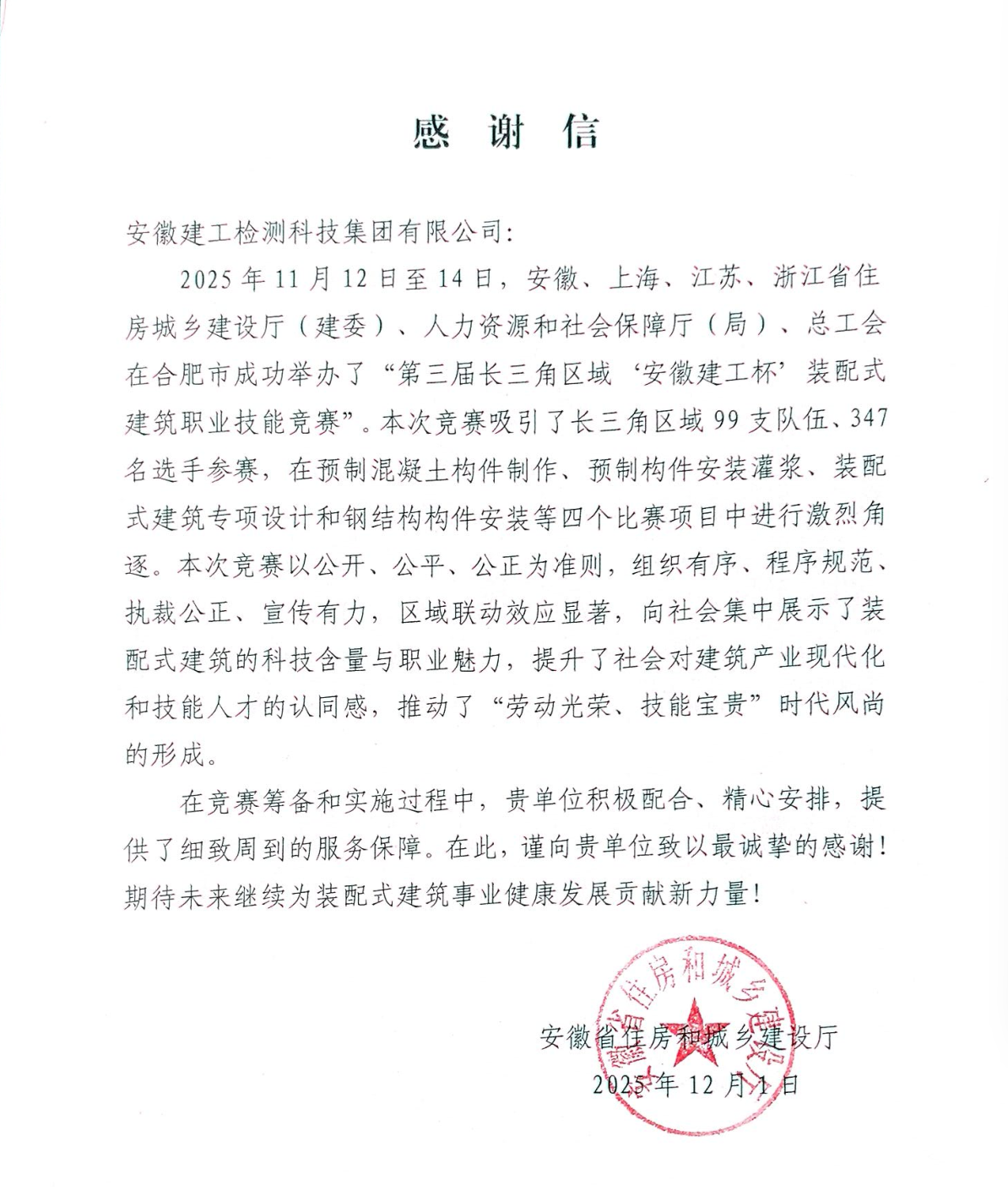近日,公司收到安徽省住房與城鄉(xiāng)建設(shè)廳感謝信,對公司服務保障“第三屆長三角區(qū)域‘安徽建工杯’裝配式建筑職業(yè)技能大賽”作出的積極貢獻表示感謝。