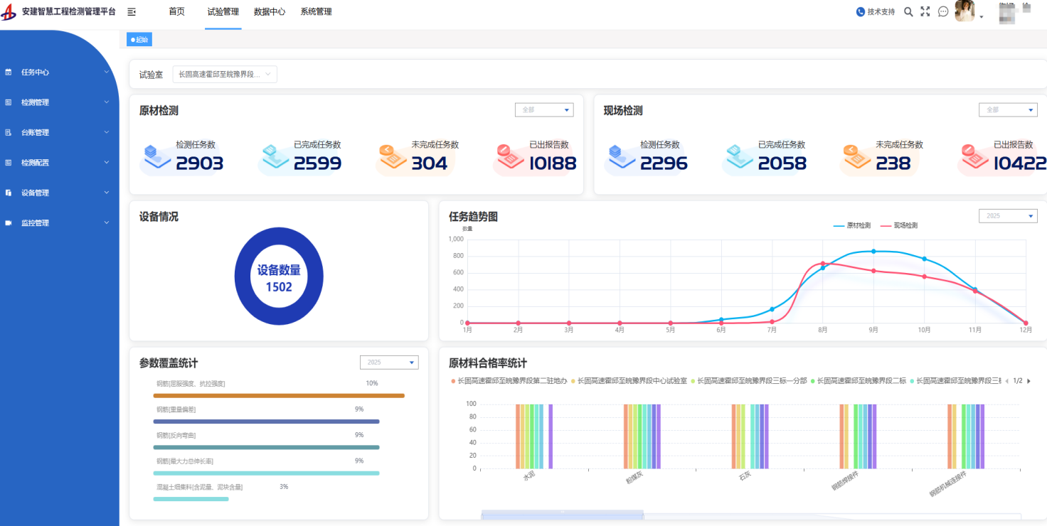 針對傳統(tǒng)檢測領域弊端,該平臺不僅打破了原有模式的數(shù)據(jù)壁壘與管理困境,更以流程標準化、操作自動化實現(xiàn)效率與精度的雙重提升,引用實時數(shù)據(jù)看板賦能科學決策,有效提升項目建設質量管控成效。以S20長固高速項目為例,平臺已接入1個中心試驗室、2個駐地辦試驗室、5個工地試驗室,實現(xiàn)1000余臺檢測設備智能互聯(lián)。自2025年6月運行以來,累計出具精準檢測報告2.45萬份,構建起質量數(shù)據(jù)閉環(huán)追溯體系,有效規(guī)避質量風險,切實筑牢生產(chǎn)安全屏障。