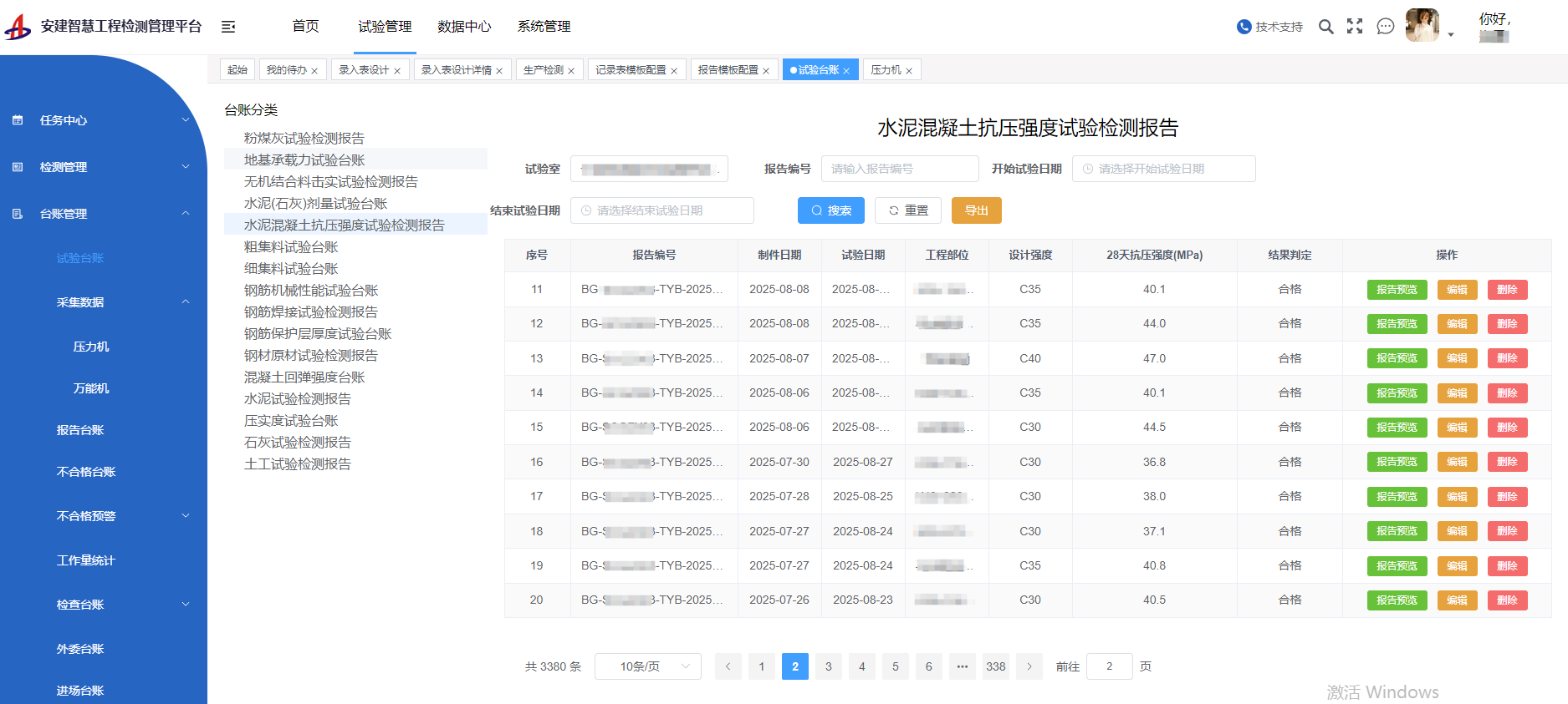 智慧平臺充分立足項目實際,兼具技術、效率、服務多重優(yōu)勢,實現(xiàn)各項核心功能精準破局。一是智慧檢測模塊可支持數(shù)據(jù)自動采集、實時上傳、自動生成報告,從源頭杜絕人為篡改,效率提升50%以上;二是線上報告內(nèi)置170余套標準模板,可自動匹配統(tǒng)一格式與智能計算規(guī)則,報告差錯率降為零;三是智慧監(jiān)控系統(tǒng)可通過高清攝像頭、自研溫濕度傳感器等設備,實現(xiàn)檢測過程全追溯、環(huán)境24小時監(jiān)測、數(shù)據(jù)異常自動告警;四是通過智能臺賬與數(shù)據(jù)中心可讓試驗結果、核心指標全程透明可溯,以直觀圖表為項目管理科學決策提供精準指引。
