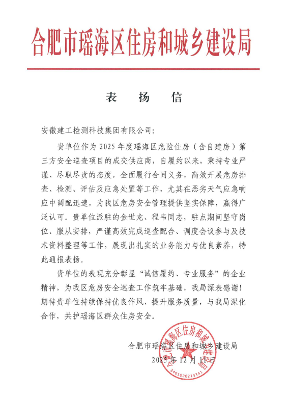 近日,瑤海區(qū)住房和城鄉(xiāng)建設局向建工檢測公司發(fā)來表揚信,對公司在2025年度瑤海區(qū)危險住房(含自建房)第三方安全巡查項目工作中的支持表示感謝,對公司職工的責任擔當和職業(yè)素養(yǎng)給予充分肯定。