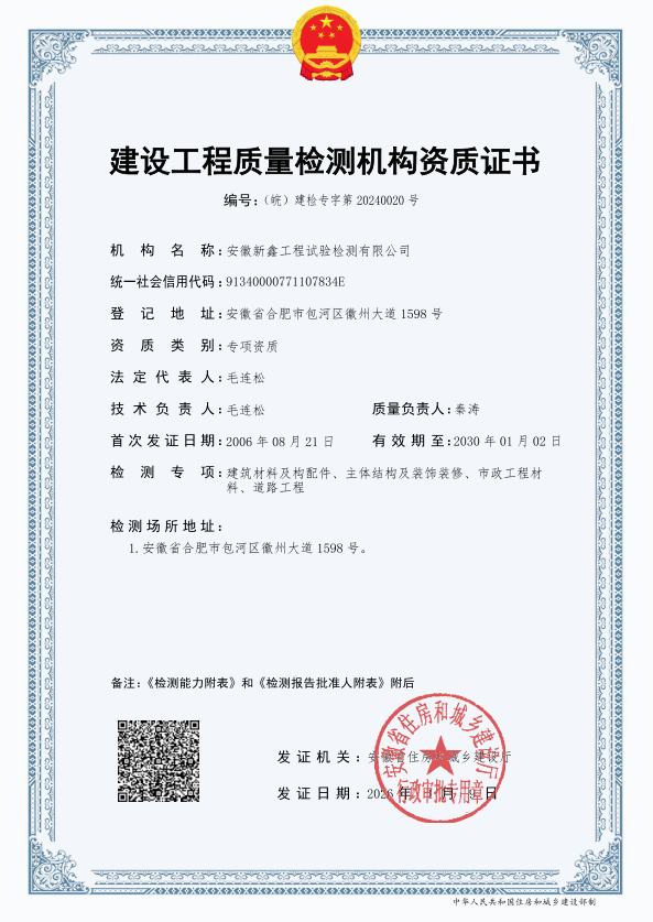 近日,經(jīng)安徽省住房和城鄉(xiāng)建設(shè)廳核準(zhǔn),新鑫檢測順利獲批主體結(jié)構(gòu)及裝飾裝修工程、道路工程專項檢測資質(zhì)。