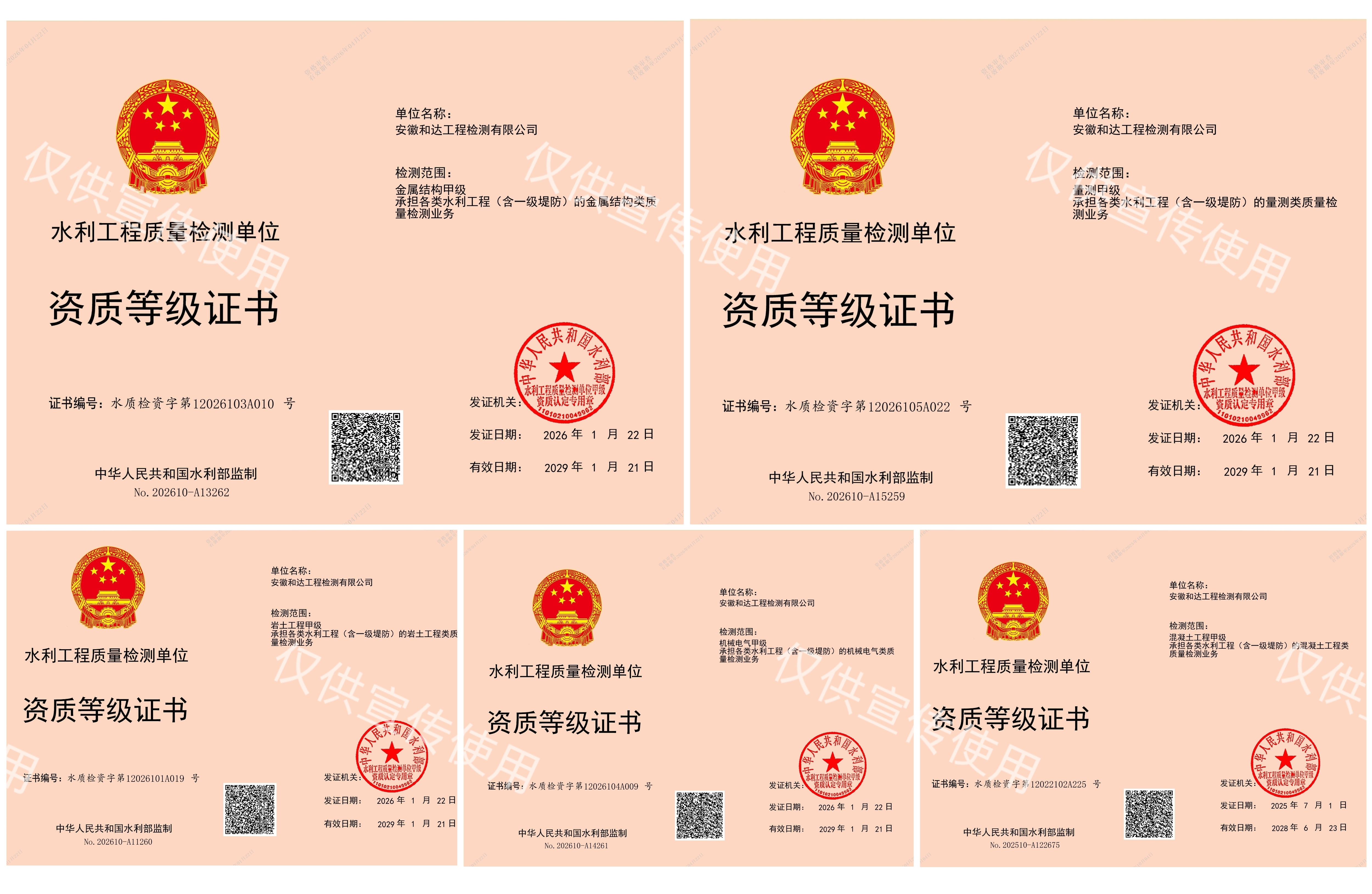 日前,建工檢測所屬和達檢測順利取得量測類、巖土工程類、金屬結(jié)構(gòu)類、機械電氣類四項水利工程質(zhì)量檢測甲級資質(zhì),結(jié)合此前已取得的混凝土工程類甲級資質(zhì),至此,和達檢測成功躋身水利工程檢測“五甲資質(zhì)”行列,順利成為擁有水利工程全項甲級檢測資質(zhì)的檢測機構(gòu)。