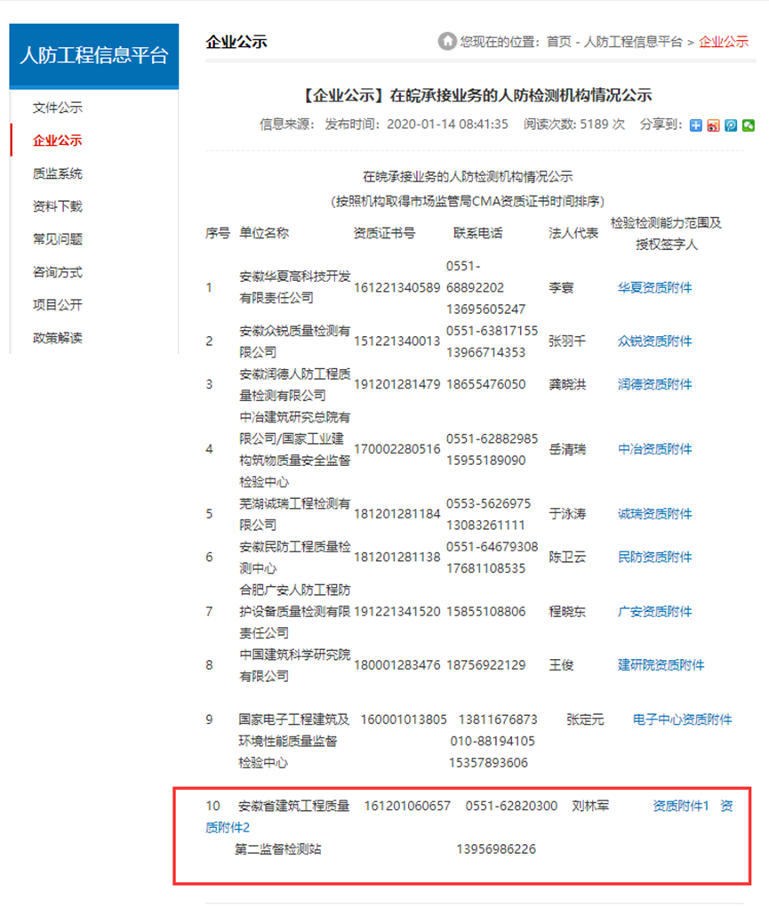 2020年1月15日,經(jīng)安徽省市場監(jiān)督管理局、安徽省人民防空辦公室的聯(lián)合批準認定,二站喜獲人防工程防護設備專項檢測資質,并且成為安徽省內(nèi)首家具備人防工程防護設備專項檢測資質的建筑工程綜合類檢驗檢測機構。