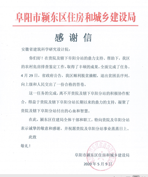 近日,安徽建科收到阜陽市潁東區(qū)住建局發(fā)來的感謝信,對安徽建科以及所屬質(zhì)檢二站阜陽分站在潁東區(qū)排查危房工作中做出的重要貢獻表述感謝。