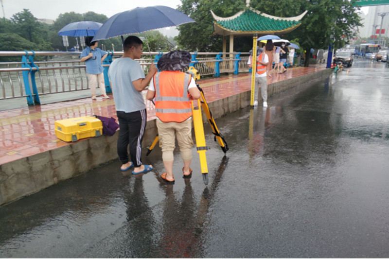 7月17日20時(shí)至19日6時(shí),合肥市區(qū)遭受70~80年一遇的強(qiáng)暴雨襲擊,暴雨造成合肥市區(qū)多地內(nèi)澇,上游水庫泄洪,南淝河水位極速上漲,超警戒水位約2米。其中,長江路橋橋下水位超出設(shè)計(jì)洪水水位,橋梁上部結(jié)構(gòu)局部淹沒。由于該橋自重較輕,洪水通過時(shí)會(huì)對(duì)橋梁產(chǎn)生浮力和沖擊力。為確保橋梁安全,主管部門對(duì)該橋采取重車壓橋的應(yīng)急措施,并委托道橋所對(duì)過程中的變形情況進(jìn)行監(jiān)測(cè)。道橋所技術(shù)人員布設(shè)監(jiān)測(cè)點(diǎn)、采用高精度電子水準(zhǔn)儀對(duì)橋面及橋墩進(jìn)行監(jiān)測(cè),從而判斷橋梁的豎向變形情況。監(jiān)測(cè)工作從19日上午10時(shí)開始,每小時(shí)監(jiān)測(cè)一次,持續(xù)至次日凌晨3時(shí)水位明顯回落。在確保洪水退到安全水位后,道橋所監(jiān)測(cè)人員方撤離現(xiàn)場(chǎng)。