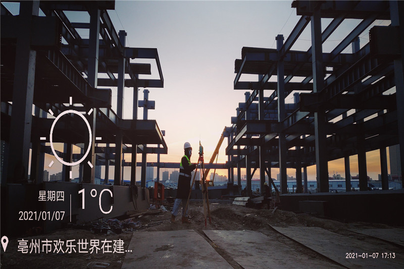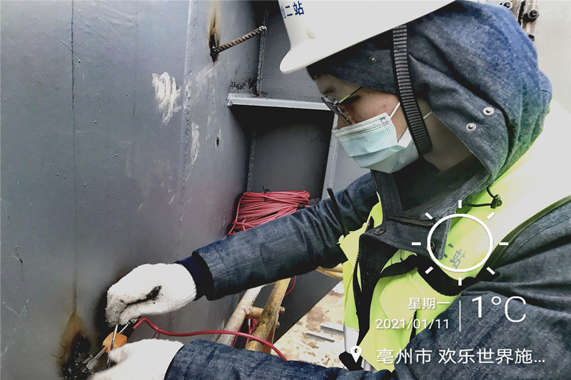 2020年末,在歲末年初、辭舊迎新之際,二站結(jié)構(gòu)二所便早早地開始研究謀劃部署,積極尋求新業(yè)務(wù)突破,與北京城房有限公司就“亳州歡樂世界項(xiàng)目智慧城市生活體驗(yàn)館鋼結(jié)項(xiàng)目”簽訂協(xié)議。該工程鋼構(gòu)件從出廠檢測到施工過程中應(yīng)力、變形全過程監(jiān)測均由我站結(jié)構(gòu)二所承擔(dān),為首個全過程介入的鋼結(jié)構(gòu)項(xiàng)目。該項(xiàng)目強(qiáng)度大、條件苦,加上天氣、現(xiàn)場工作條件、夜間作業(yè)等種種困難,任務(wù)十分艱巨。二站結(jié)構(gòu)二所副所長李平介紹說:“二站監(jiān)測業(yè)績稀缺,實(shí)踐經(jīng)驗(yàn)和技術(shù)的磨練更為重要”。于是,李平綜合權(quán)衡輕重后,決定暫停其他檢測項(xiàng)目,迅速拉起隊(duì)伍,帶領(lǐng)二站結(jié)構(gòu)二所檢測精英小分隊(duì)于2020年最后一天凌晨抵達(dá)工程現(xiàn)場,打響了2021年檢測業(yè)務(wù)第一槍。