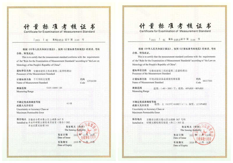 經(jīng)過(guò)近一年的積極籌備,近日,二站特檢所順利通過(guò)省計(jì)量標(biāo)準(zhǔn)考核委員會(huì)的現(xiàn)場(chǎng)評(píng)審,取得了安徽省市場(chǎng)監(jiān)督管理局頒發(fā)的千斤頂檢定裝置、0.3級(jí)測(cè)力儀標(biāo)準(zhǔn)裝置、鋼筋保護(hù)層、樓板厚度測(cè)量?jī)x校準(zhǔn)裝置、非自動(dòng)衡器檢定裝置、環(huán)境試驗(yàn)設(shè)備溫濕度校準(zhǔn)裝置、天平檢定裝置計(jì)量標(biāo)準(zhǔn)考核證書。