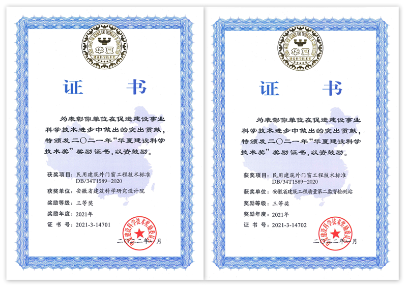 近日,我院及二站主持申報的《民用建筑外門窗工程技術(shù)標準 DB/34T1589-2020》項目榮膺“華夏建設(shè)科學(xué)技術(shù)”三等獎。