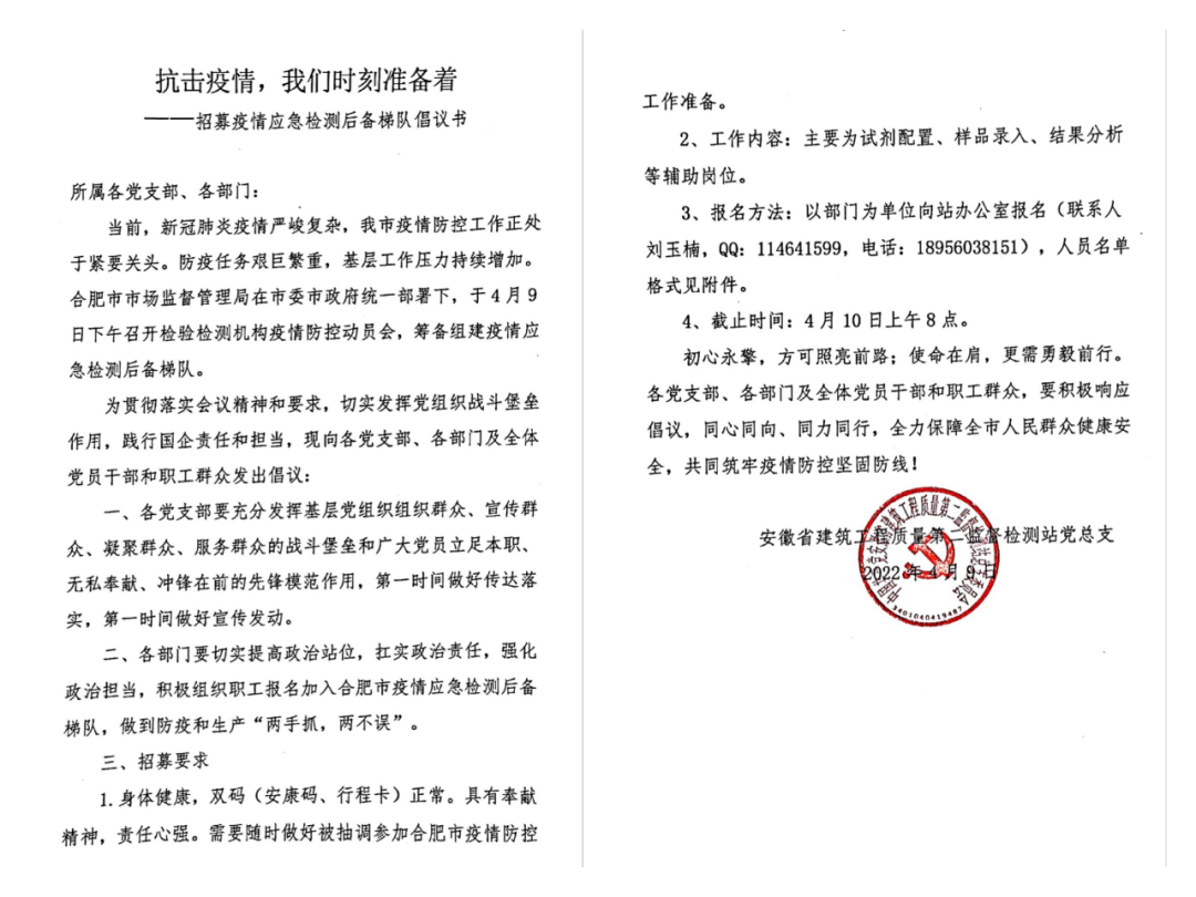 當晚,全站上下聞令而動,積極響應征募號召。截止4月10日8時許,80余名專業(yè)檢驗檢測人員自愿報名加入合肥市疫情應急檢測后備梯隊,隨時準備接受抽調(diào),隨時準備在抗“疫”最前線完成檢驗試劑配置、樣品錄入、結(jié)果分析等工作。