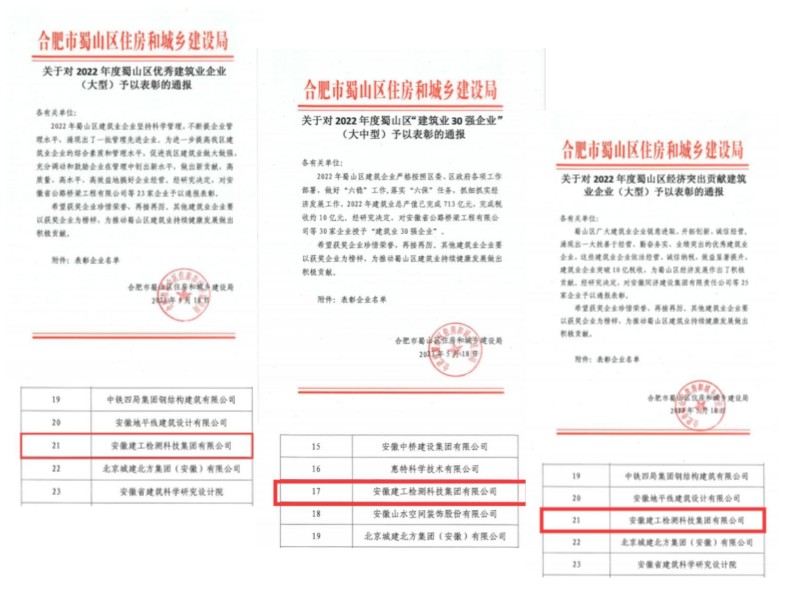 2023年5月18日,合肥市蜀山區(qū)住房和城鄉(xiāng)建設(shè)局發(fā)布對區(qū)內(nèi)建筑業(yè)企業(yè)予以表彰的通報,我司榮獲“優(yōu)秀建筑業(yè)企業(yè)”、“建筑業(yè)30強(qiáng)企業(yè)”、“經(jīng)濟(jì)突出貢獻(xiàn)建筑業(yè)企業(yè)”3類獎項(xiàng)。