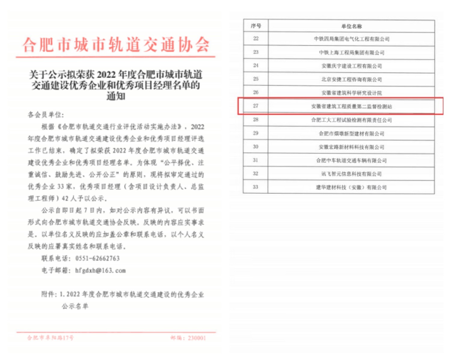 6月16日,從合肥市城市軌道交通協(xié)會傳來喜訊,安徽建工檢測科技集團有限公司獲評2022年度合肥市城市軌道交通建設(shè)“優(yōu)秀企業(yè)”稱號。